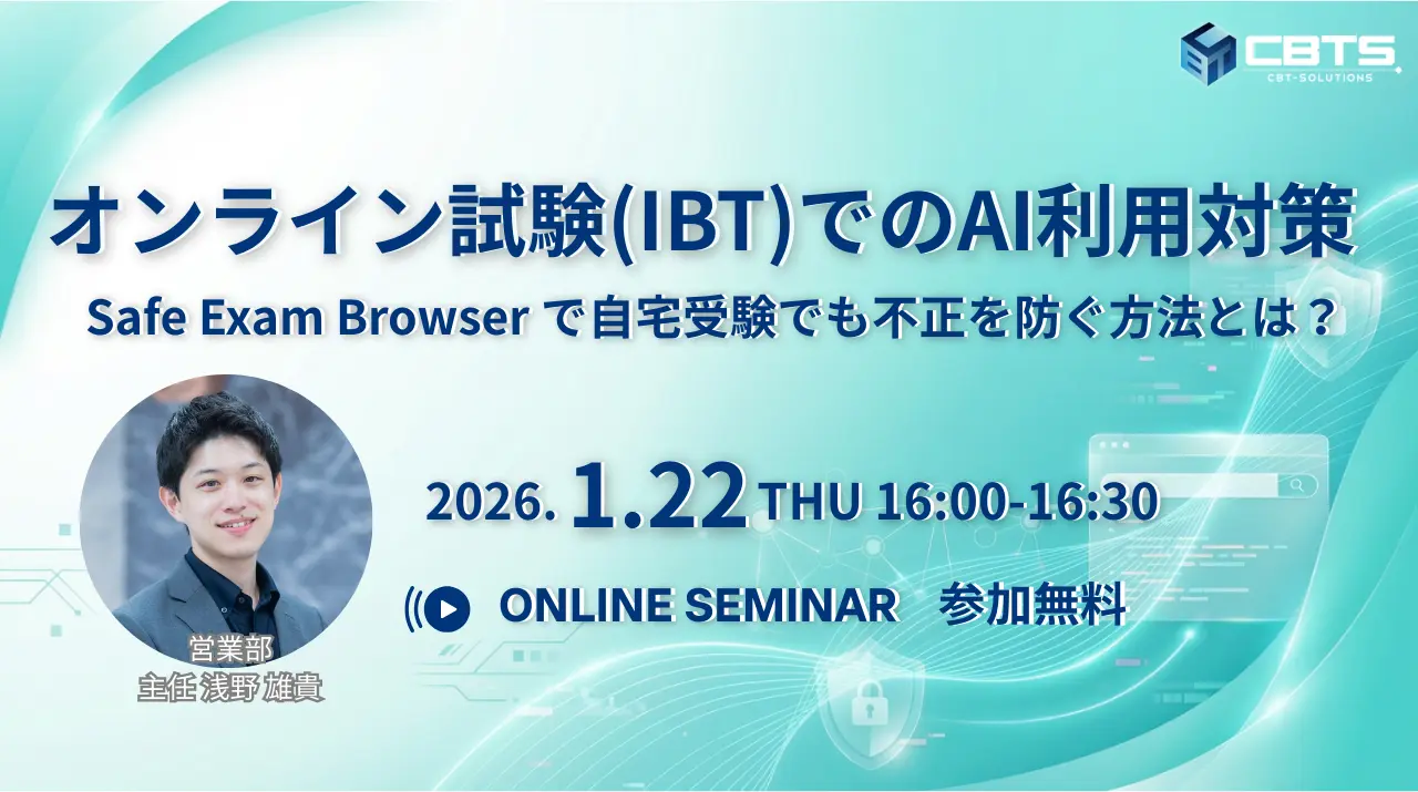 シー・ビー・ティ・ソリューションズ(CBTS)は、無料セミナー「オンライン試験(IBT)でのAI利用対策~ Safe Exam Browser で自宅受験でも不正を防ぐ方法とは?~」を1月22日に開催する。