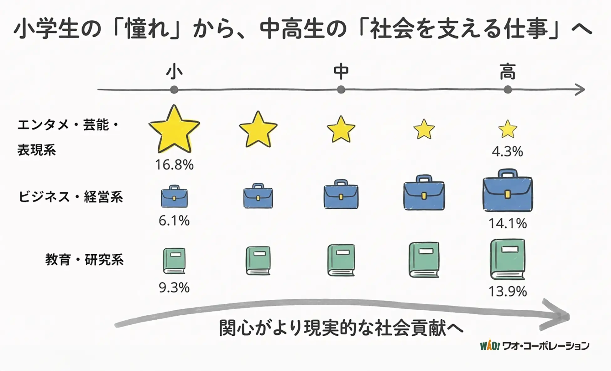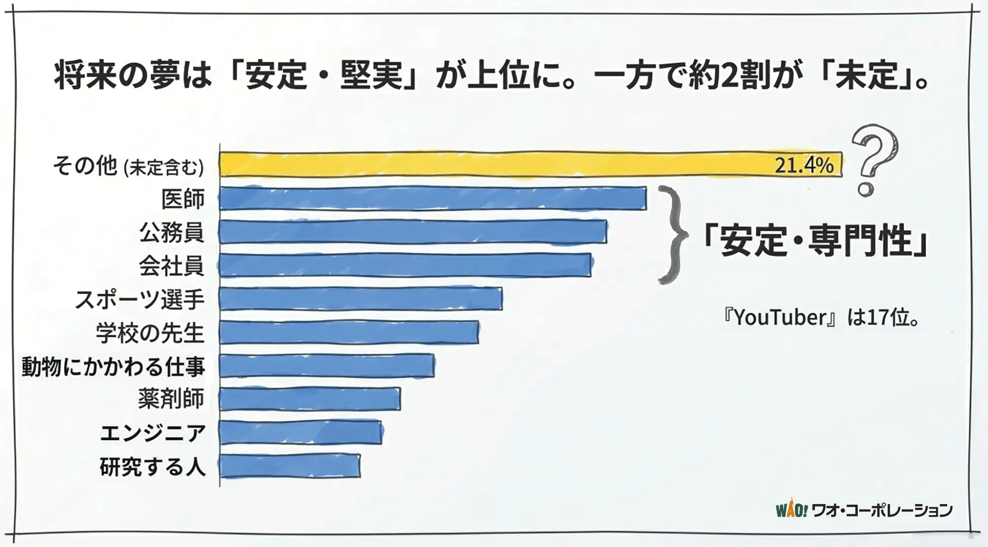 一方、将来像では「その他・未定」が21.4%で最多となり、職業名を固定して描きにくい層が一定数いることが示された。