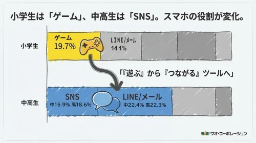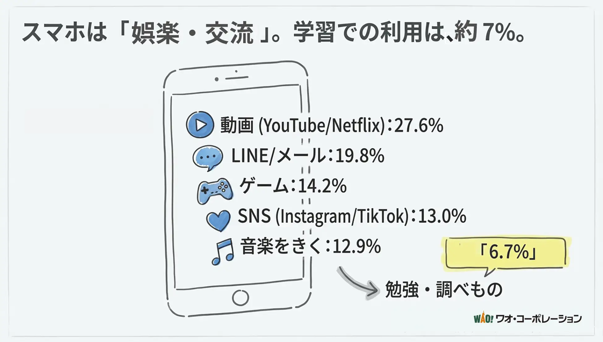 家庭でのスマホ・PC・タブレット利用は「動画視聴」が27.6%で最多となり、学習(勉強・調べもの)は6.7%にとどまった。
