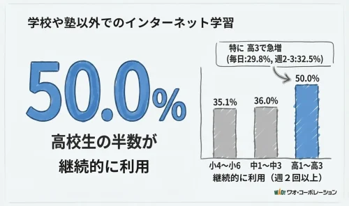 学校や塾以外でのネット学習は、週2回以上の継続利用が全体で39.5%、高3では62.3%に達した一方、「使ったことはあるが今は使っていない」と「一度も使ったことがない」を合わせた層も18.9%あった。