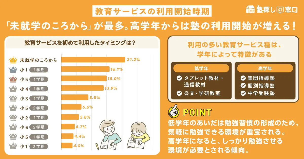 調査は子どもを持つ保護者(30代~50代)を対象に昨年11月・12月に行われ、408名から有効回答を得た。それによると、教育サービスを利用し始めたタイミングは、回答率の高い順に「就学前から」21.2%、「小1の1学期」16.1%、「小5の1学期」15.0%となった。