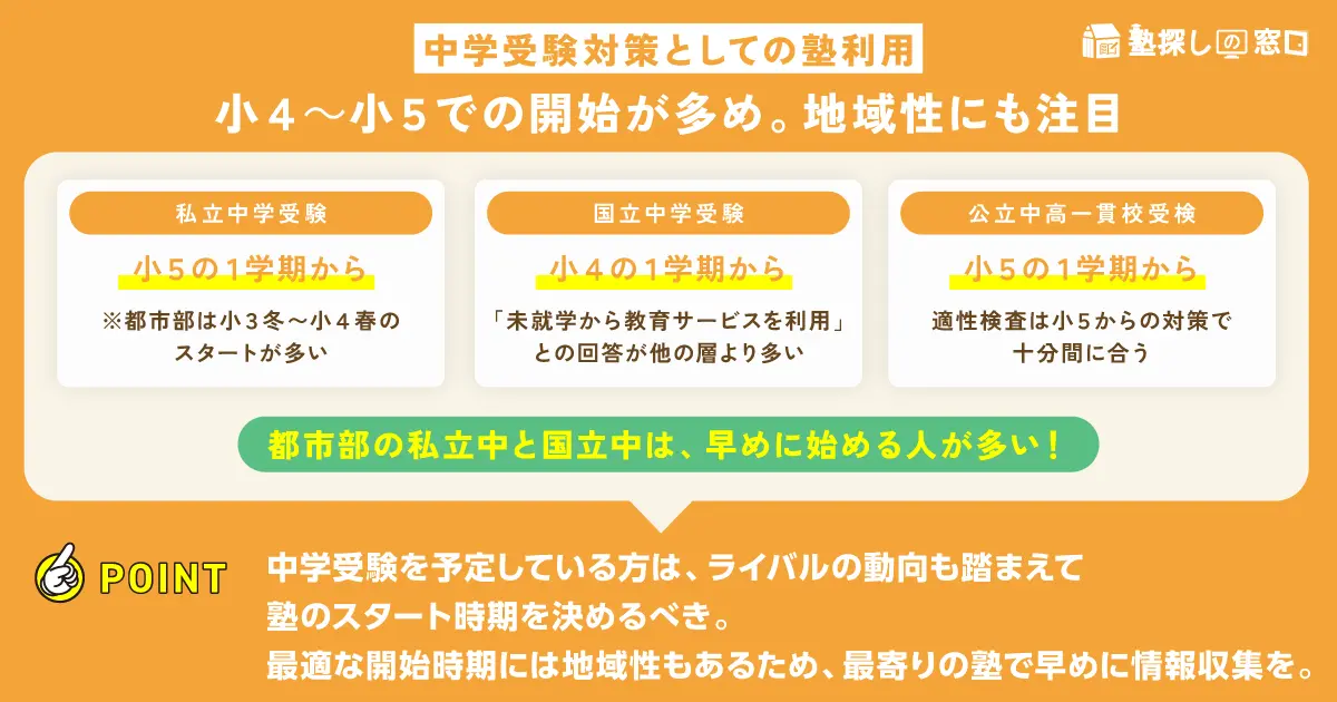 調査では中学受験の有無と教育サービスの利用開始時期との関連性も調査した。それによると、公立中高一貫校を受験した家庭では、小5の1学期から教育サービスの利用を始めたという回答が最多となった。私立中学の場合も小5の1学期との回答が多かったが、競争率の高い都内の保護者からは「小3の3学期」「小4の1学期」といった回答も多く寄せられた。また、国立中受験に向けては、「小4の1学期」から教育サービスを利用し始めたという回答が目立った。