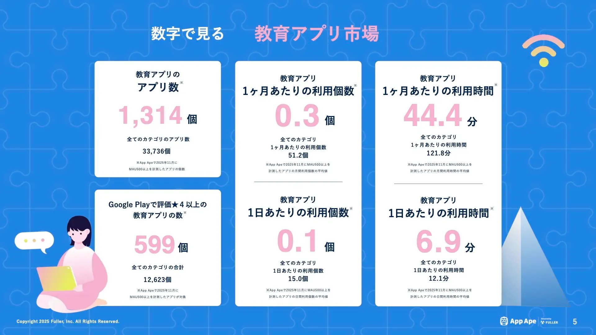 フラーは14日、アプリ市場分析サービス「App Ape」のデータをもとに教育アプリ市場動向や利用実態をまとめた「教育・学習アプリ市場調査レポート2025」を公開した。