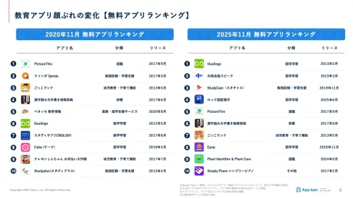 2020年と2025年の無料アプリランキングを比較すると、語学学習アプリを中心に新しいアプリの登場が目立つ。近年はAIを活用した英会話アプリや、学習を習慣化するための記録・支援アプリなど、学習スタイルの多様化が進んでいる様子が窺える。
