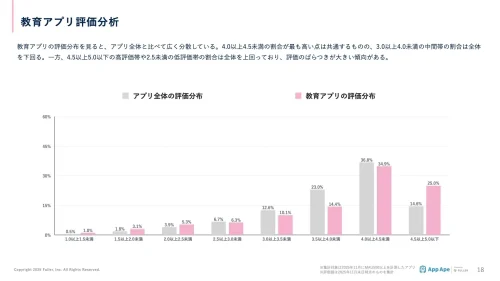 さらに、教育アプリの評価分布を見ると、アプリ全体と比べて広く分散しており、4.0以上4.5未満の割合が最も高い点は共通するものの、評価のばらつきが大きい傾向が見られる。