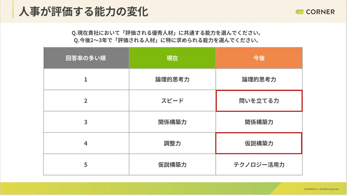 コーナーは14日、企業の人事担当者を対象に実施した「AI時代の人事・組織実態調査」結果を公表し、AI時代において評価される人材像が大きく変化しつつあることを明らかにした。