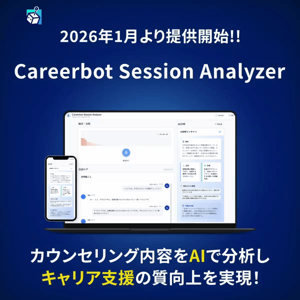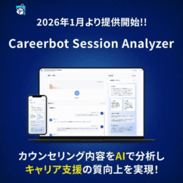「Careerbot Session Analyzer」は、キャリアカウンセリングの内容をAIが分析し、「カウンセリング内容の要約」、「学生の主訴(悩みや課題)」、「学生が目指している目標」、「思考の偏りや課題の特定」、「次回以降の支援方針」といった要素を可視化するサービス。