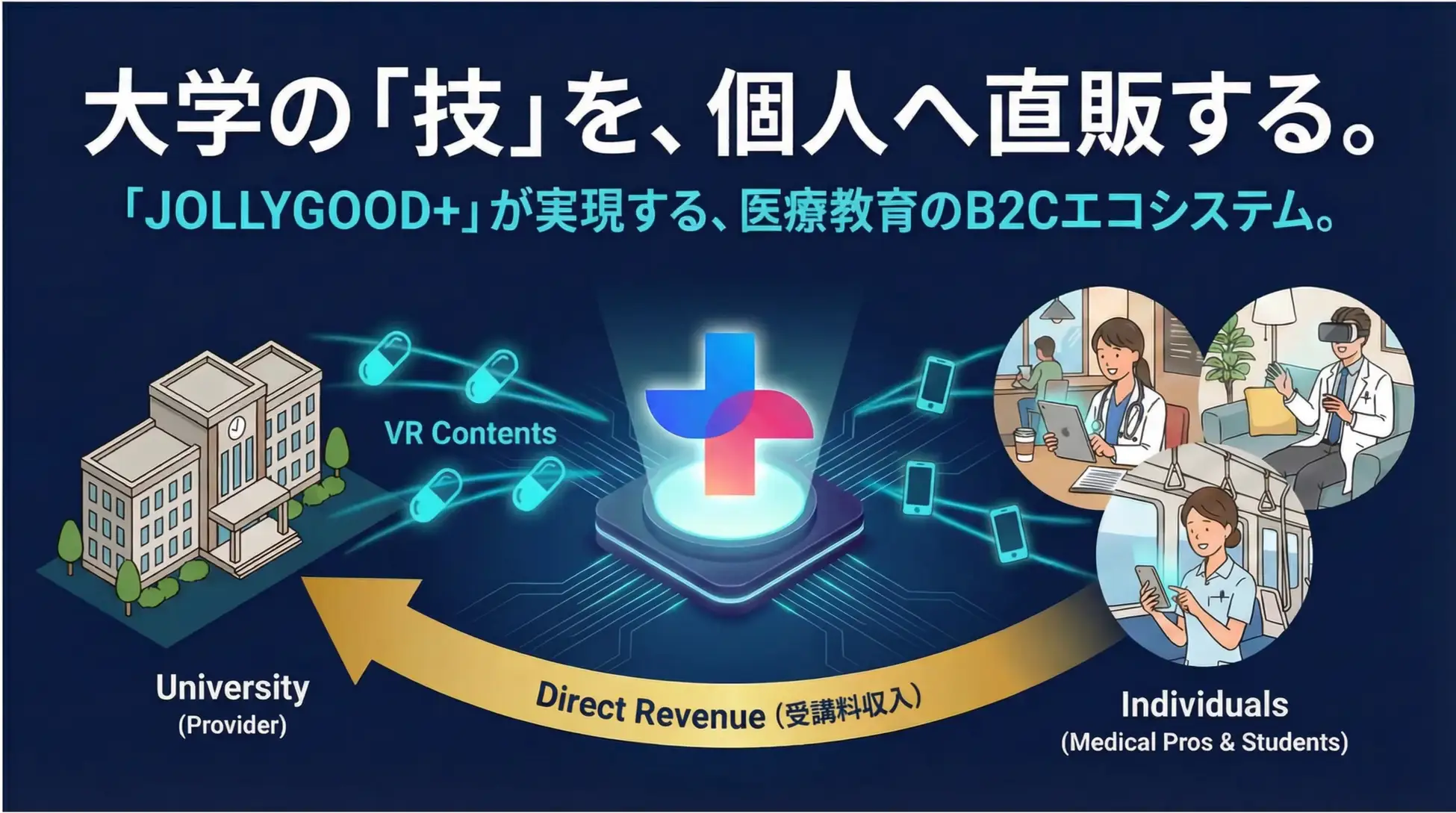 「JOLLYGOOD+ プロプラン」は、スマホ、タブレット、VRゴーグルを使って、いつでもどこでも本格的な臨床実習を行えるサブスクリプションサービス。大学が「コンテンツプロバイダー」となり、自院の症例や手技をVR教材化して「JOLLYGOOD+」上で配信・販売するための事業立ち上げ支援パッケージ。