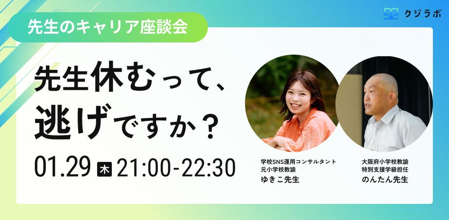 クジラボは、教員の休職をテーマとしたオンラインイベント「【先生のキャリア座談会】先生休むって、逃げですか?」を1月29日に開催する。