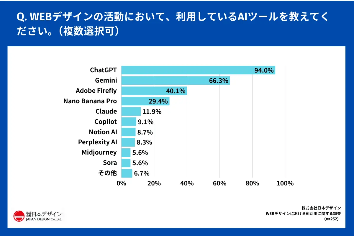 WEBデザインの活動で、「利用しているAIツール」を尋ねたところ、「ChatGPT」が94.0%で圧倒的多数だった。以下、「Gemini」66.3%、「Adobe Firefly」40.1%、「NanoBananaPro」29.4%、「Claude」11.9%、「Copilot」9.1%などが続いた。