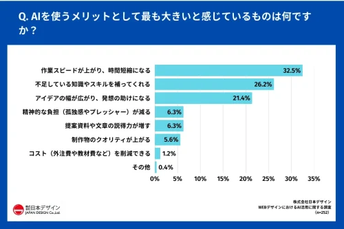また、「AIを使うメリットとして最も大きいと感じているもの」を聞いたところ、「作業スピードが上がり、時間短縮になる」が32.5%で最多だった。以下、「不足している知識やスキルを補ってくれる」26.2%、「アイデアの幅が広がり、発想の助けになる」21.4%、「精神的な負担(孤独感やプレッシャー)が減る」6.3%、「提案資料や文章の説得力が増す」6.3%、「制作物のクオリティが上がる」5.6%、などが続いた。