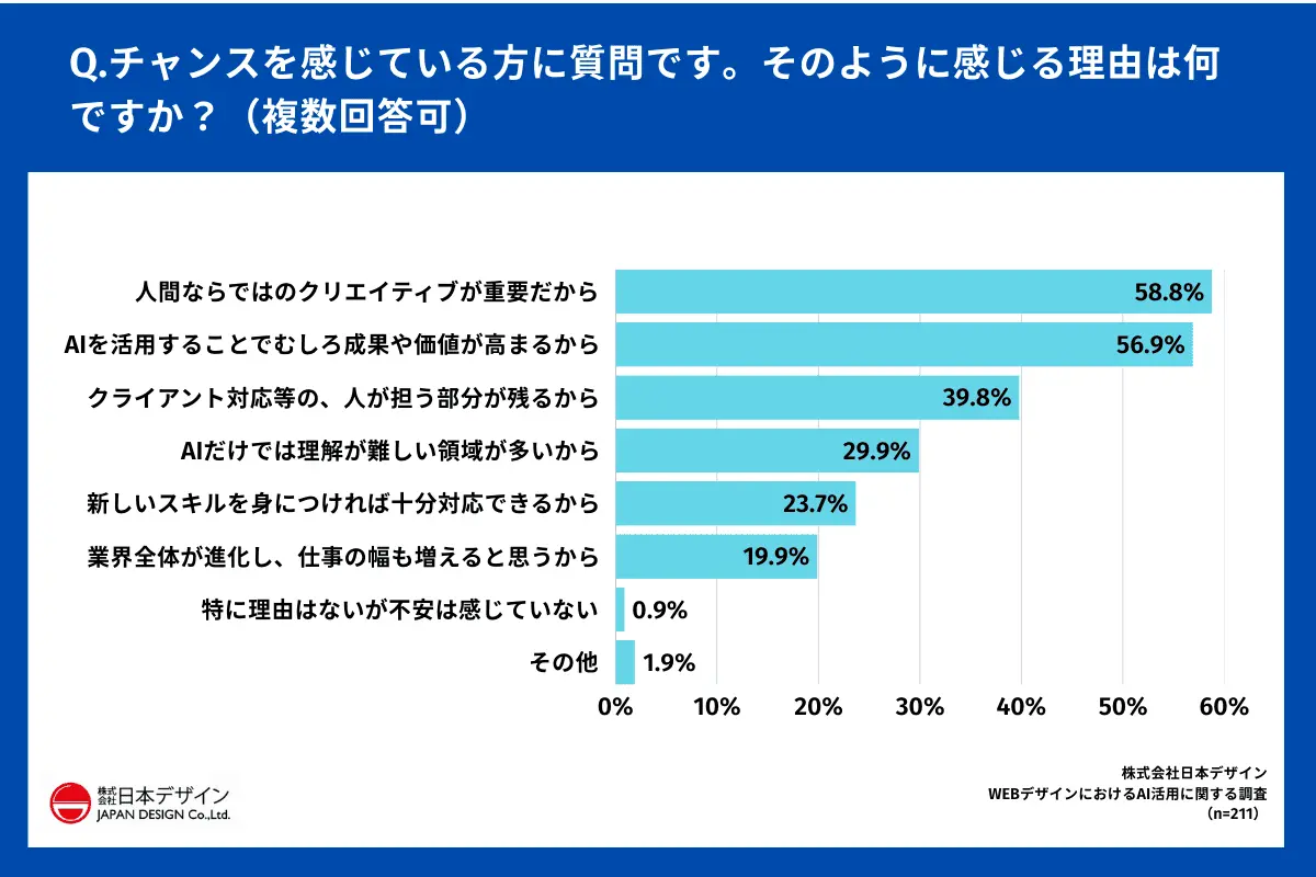 「チャンスと感じる理由」を尋ねたところ、最も多かったのは「人間ならではのクリエイティブが重要だから」58.8%で、以下、「AIを活用することでむしろ成果や価値が高まるから」56.9%、「クライアント対応などの、人が担う部分が残るから」39.8%、「AIだけでは理解が難しい領域が多いから」29.9%、などの理由が挙げられた。