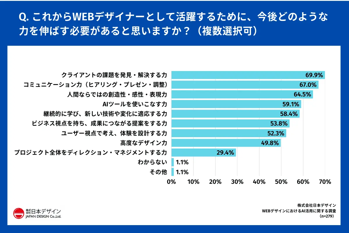 最後に、「これからWEBデザイナーとして活躍するために、今後どのような力を伸ばす必要があると思うか?」を聞いたところ、最も多かったのは「クライアントの課題を発見・解決する力」69.9%で、以下、「コミュニケーション力(ヒアリング・プレゼン・調整)」67.0%、「人間ならではの創造性・感性・表現力」64.5%、「AIツールを使いこなす力」59.1%、などの意見が寄せられた。