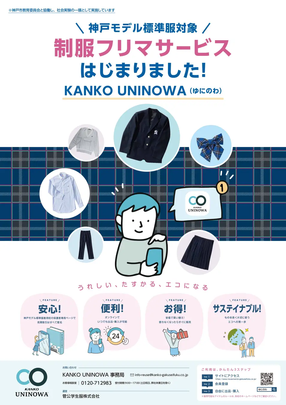 菅公学生服(カンコー学生服)は20日、神戸市教育委員会が実施する「神戸モデル標準服リユースシステム導入社会実験」の運営パートナー事業者として選定されたことに伴い、2026年1月下旬より、カンコー学生服が運営する制服専用フリマサービス「UNINOWA(ゆにのわ)」を、神戸市立中学校62校を対象に運用開始すると発表した。