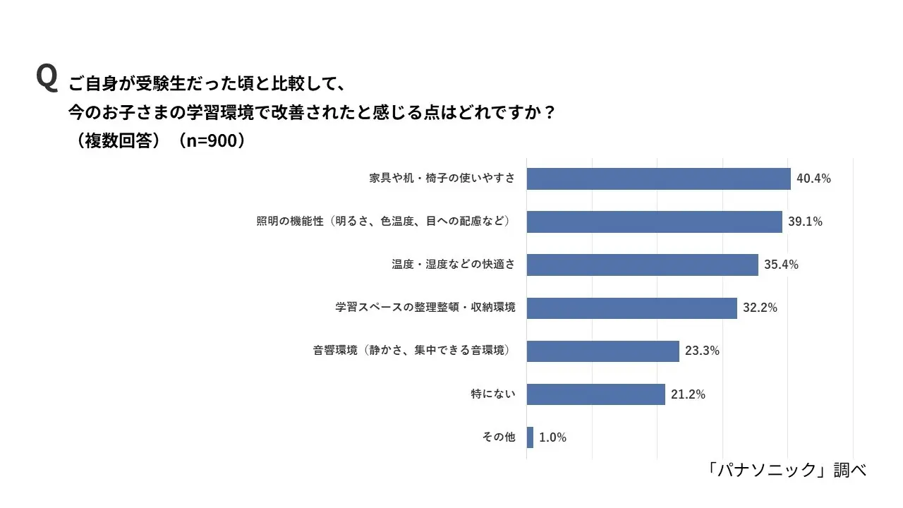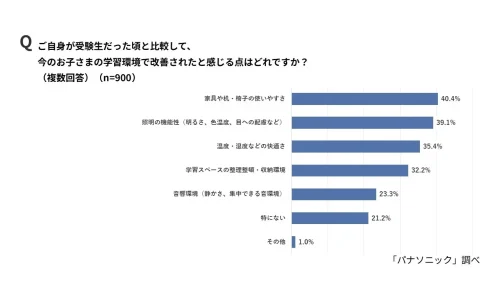 親自身が受験生だった頃と比較して、今の子どもの学習環境で改善されたと感じる点を聞いたところ、「家具や机・椅子の使いやすさ」が40.4%で最も多く、次いで「照明の機能性(明るさ、色温度、目への配慮など)」39.1%だった。