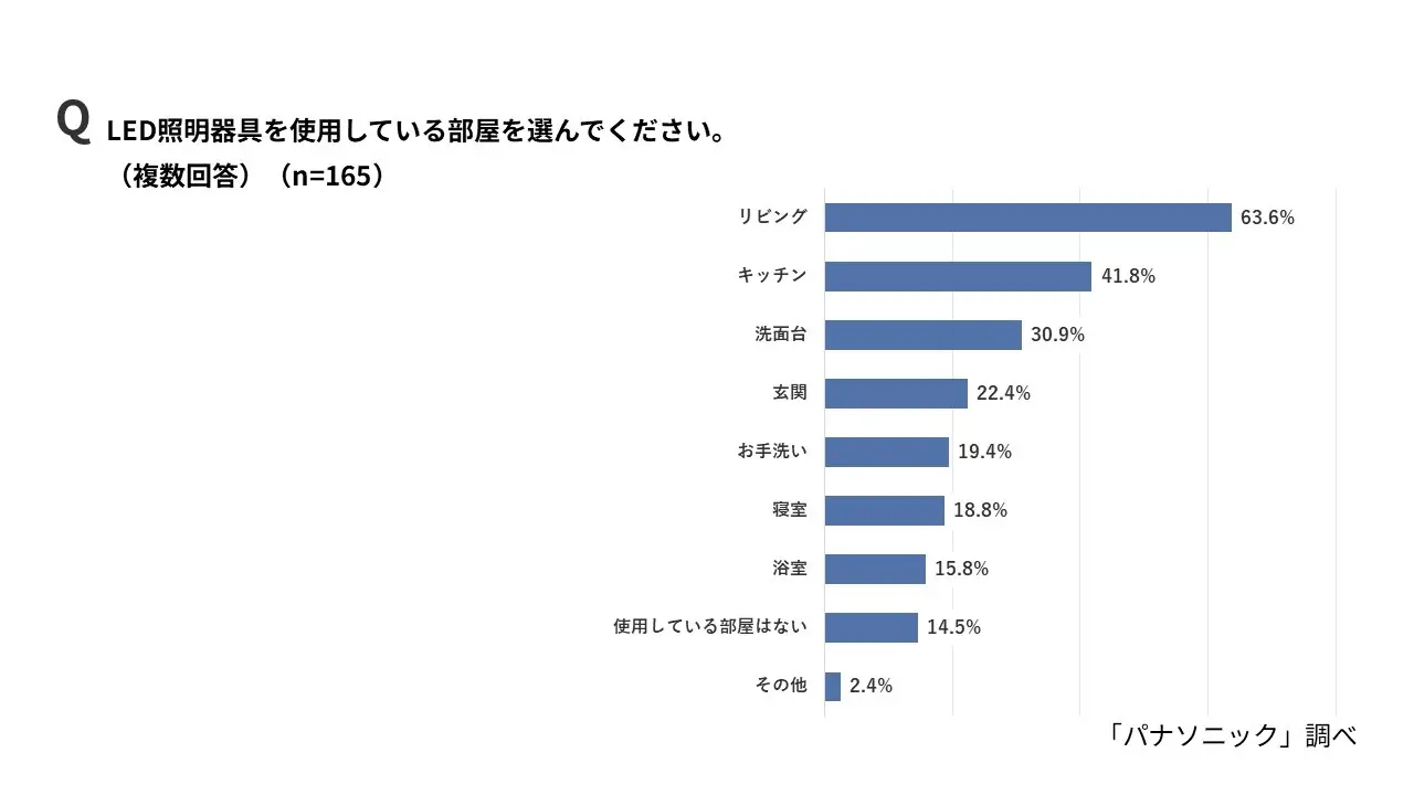 また、「蛍光灯照明器具」と回答した親に、LED照明器具を使用している部屋を聞いたところ、「リビング」が63.6%、「キッチン」が41.8%という結果になり、家族が一緒に過ごす場所に比べて子ども部屋はLEDへの移行が進んでいない傾向にあるのが分かった。