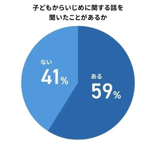 それによると、「子どもからいじめに関する話を聞いたことがあるか」と質問したところ、約6割(59%)が「聞いたことがある」と回答した。学校生活が落ち着いているように見えても、子どもの周囲では予想以上に頻繁にトラブルが起きている可能性がある。