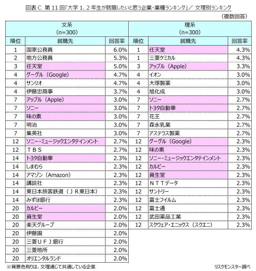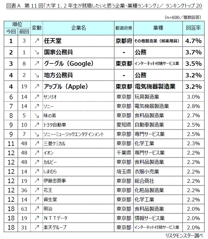 3. 大学1・2年生が就職したい企業ランキング、1位は「任天堂」=リスクモンスター調べ=