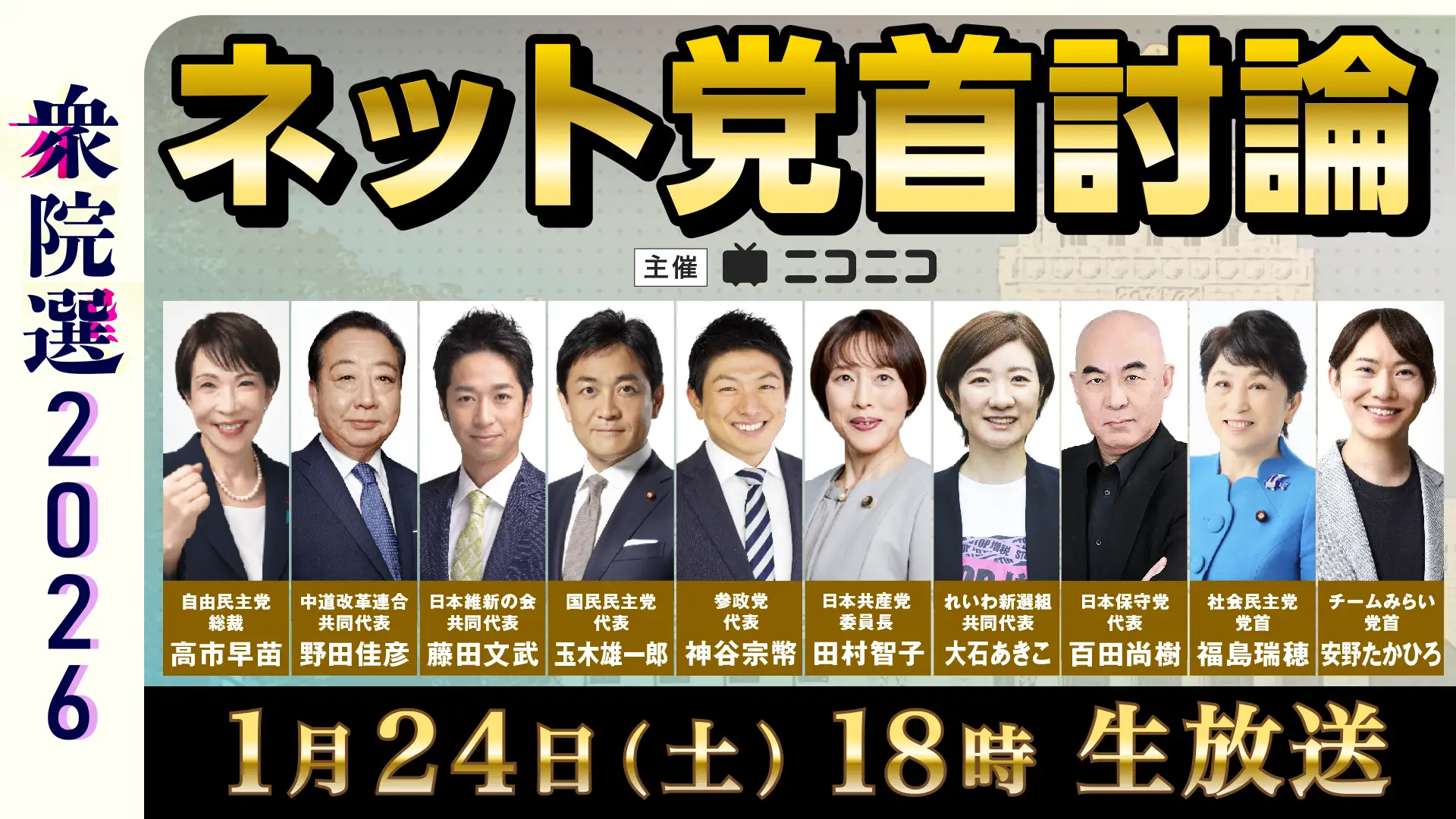 - N高グループ、高校生が24日開催「【衆院選2026】ネット党首討論」に出演し10党党首に質問(2026年1月24日)
