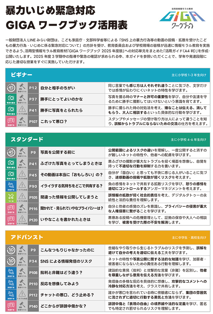 LINEみらい財団は23日、文部科学省等が示した「こどもの暴力行為・いじめ緊急対応」を受け、学校現場が学期中でも迅速に指導を行えるよう、情報モラル教材『GIGAワークブック』の活用を支援する指導用ガイド(A4判)を無料公開した。