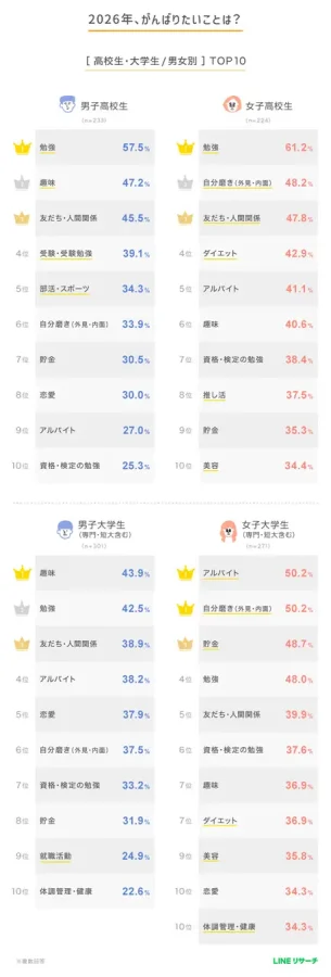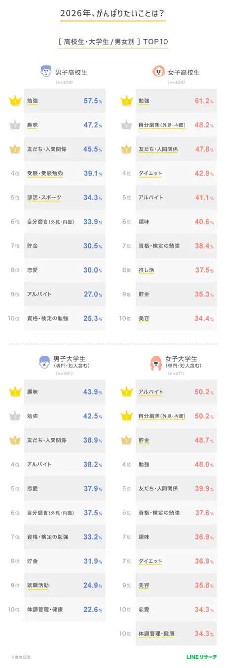 それによると、2026年にがんばりたいことTOP3は、高校生では「勉強」「友だち・人間関係」「趣味」、大学生では「勉強」「アルバイト」「自分磨き(外見・内面)」となった。今年の目標や抱負については、高校生からは「将来に向けて今のうちに勉強をがんばりたい」「初めて友だちと旅行に行く」などの声が、大学生からは「就活や卒論をがんばる」「目標額までお金を貯めたい」「自分を好きになりたい」といった目標が挙がった。