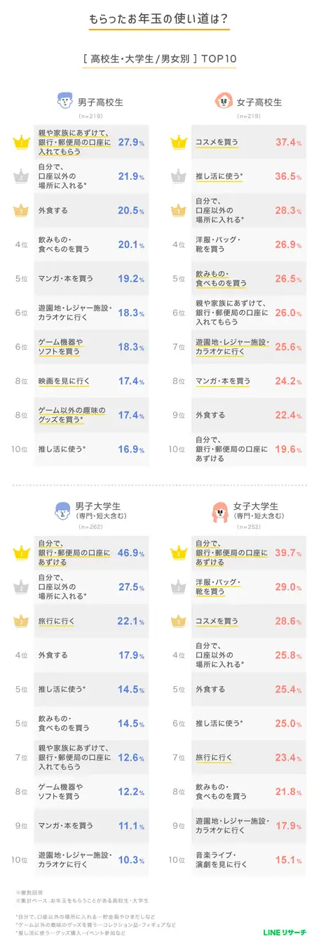 お年玉の使い道は、男子高校生では「親や家族に預けて銀行・郵便局の口座に入れてもらう」が1位に、女子高校生では貯金よりも「コスメを買う」「推し活に使う」が上位になった。大学生では、「自分で銀行・郵便局の口座に預ける」が男女とも1位。「旅行に行く」が男子で3位、女子で7位にランクインした。