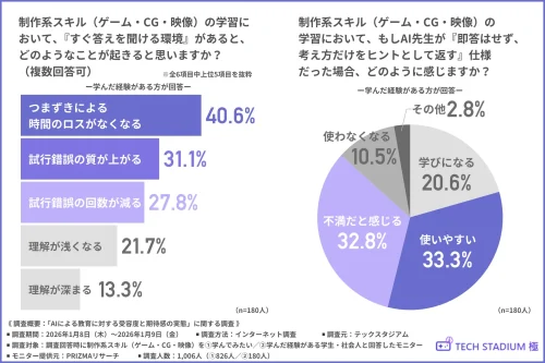 LYUSは23日、同社が運営するテックスタジアムが、制作系スキル(ゲーム・CG・映像)を学んでみたい/学んだ経験がある学生・社会人を対象に実施した「AIによる教育に対する受容度と期待感の実態」に関する調査結果を発表した。