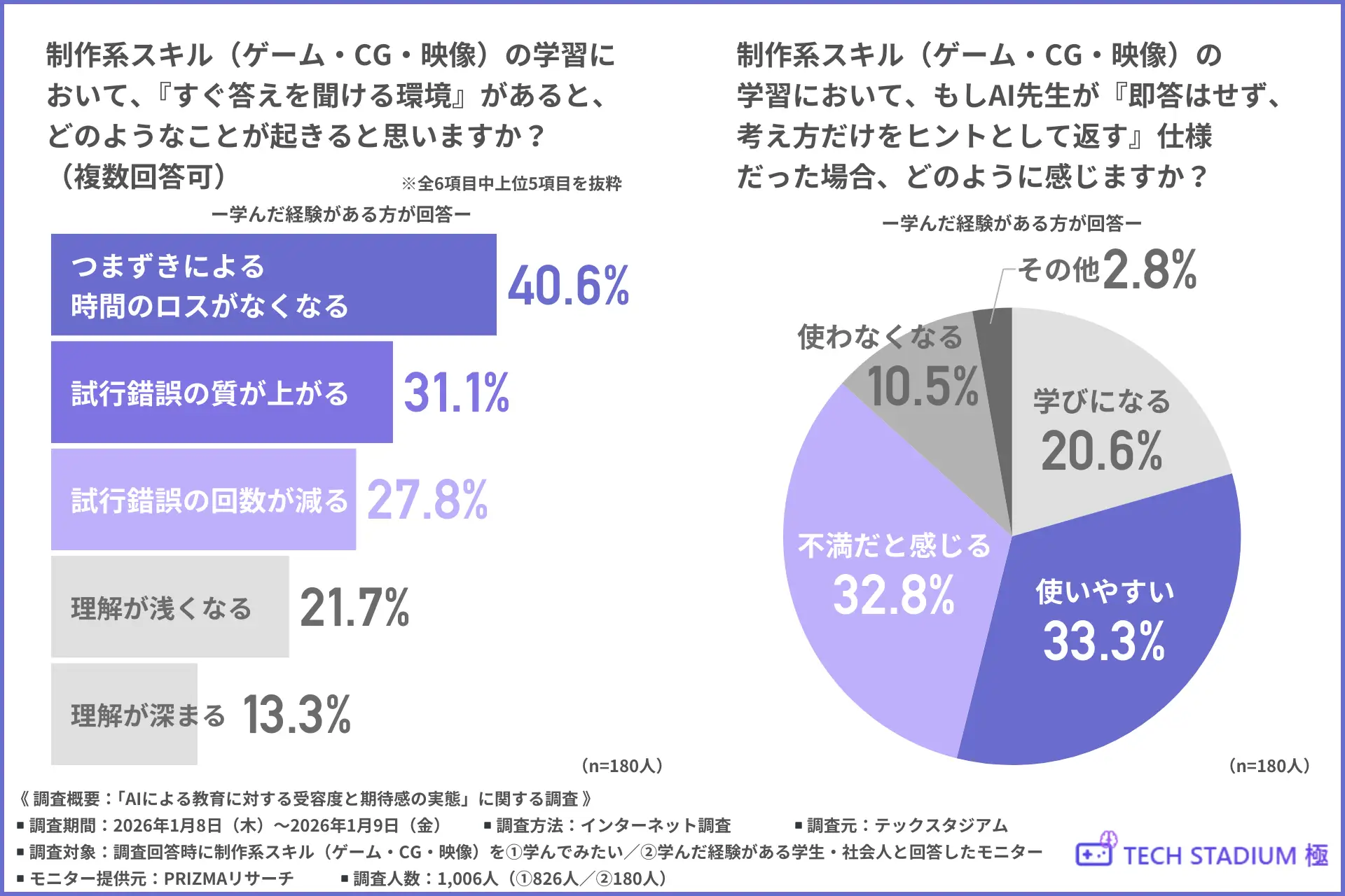 「制作系スキル(ゲーム・CG・映像)の学習において、もしAI先生が『即答はせず、考え方だけをヒントとして返す』仕様だった場合、どのように感じるか」と尋ねたところ、『使いやすい(33.3%)』『不満だと感じる(32.8%)』『学びになる(20.6%)』となった。