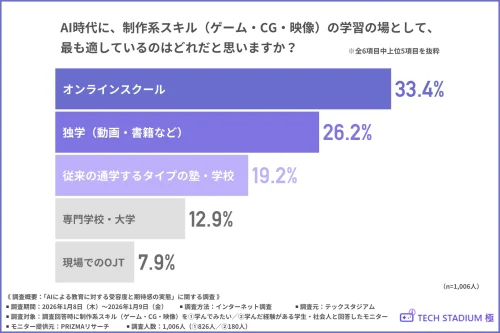 全員に対して、「AI時代に、制作系スキル(ゲーム・CG・映像)の学習の場として、最も適しているのはどれだと思うか」の問いには、『オンラインスクール(33.4%)』が最多、『独学(動画・書籍など)(26.2%)』『従来の通学するタイプの塾・学校(19.2%)』となった。