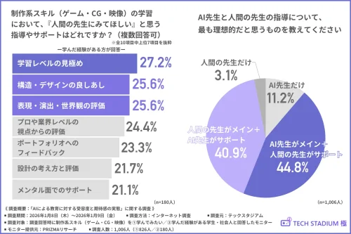 制作系スキル(ゲーム・CG・映像)を学んだ経験がある人に、「制作系スキル(ゲーム・CG・映像)の学習において、『人間の先生にみてほしい』と思う指導やサポート」について尋ねたところ、『学習レベルの見極め(27.2%)』『構造・デザインの良しあし(25.6%)』『表現・演出・世界観の評価(25.6%)』となった。
