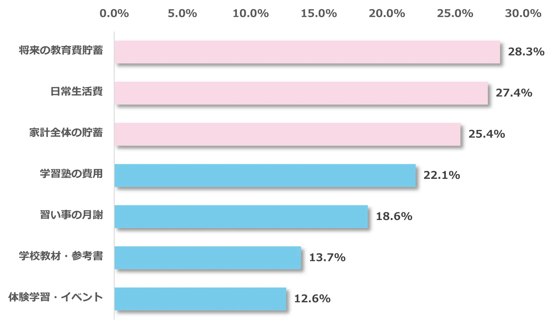 一方、給食費無償化や教育費の負担軽減で生じた余剰費用について、「今後どのような用途に充てたいか」を聞いたところ、最も多かったのは「将来の教育費貯蓄」28.3%で、以下、「日常生活費」27.4%、「家計全体の貯蓄」25.4%などが続いた。一時的な消費ではなく、将来の学びや家庭の安定に向けて計画的に活用しようとする意識が強く、教育費負担の軽減が、長期的な教育投資や家計の健全化につながっている様子が伺える。