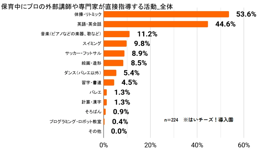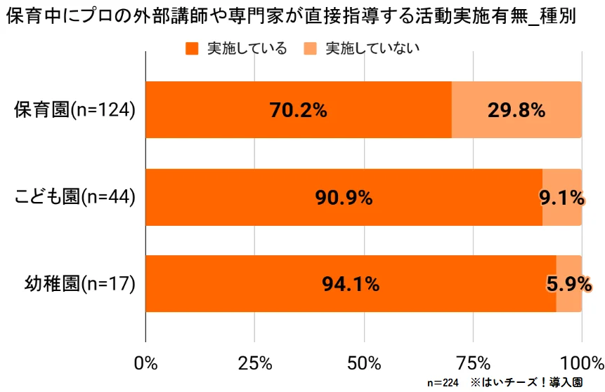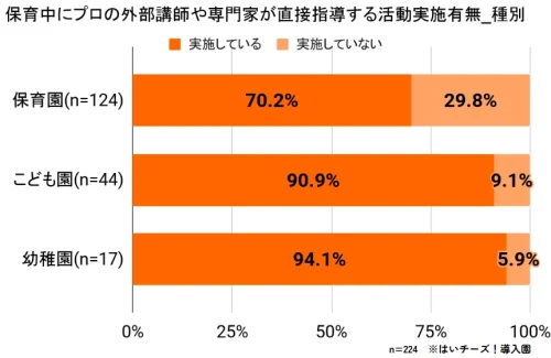 それによると、全体の73.2%の園が、保育中にプロ外部講師や専門家による活動を実施している結果となった。