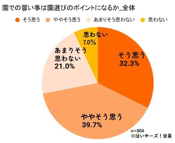 園を選ぶ際、保育中に実施される習い事がポイントになるかという問いに対しては「そう思う(32.3%)」「ややそう思う(39.7%)」と合わせて72.0%の保護者が肯定的に回答した。