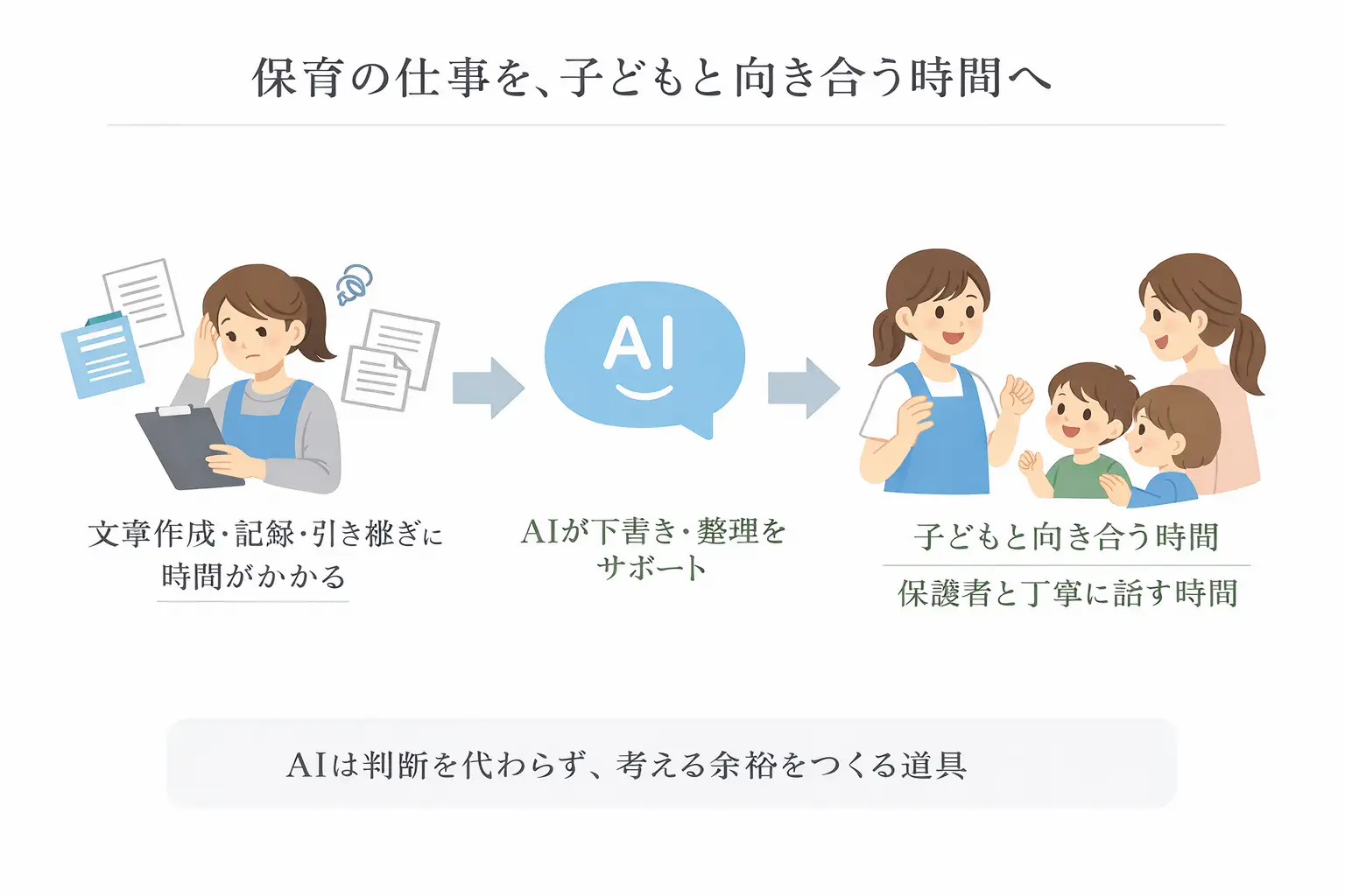「みらいくAIラボ」は、AIの操作方法を学ぶ研修ではない。保育現場の実際の仕事を題材に、文章作成や業務整理のプロセスをAIとともに見直し、現場で使える形に落とし込んでいく“実践型のラボ”。