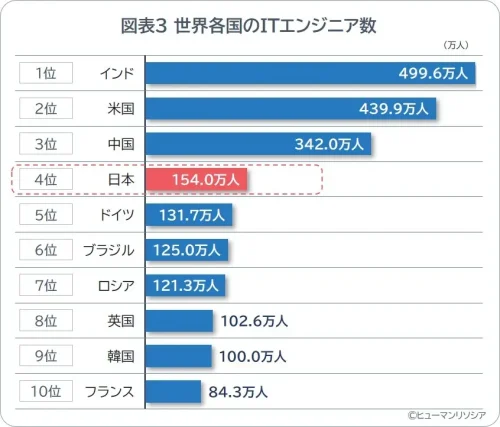 3. 世界のITエンジニア数が3000万人突破、インドが米国を引き離し首位独走、日本は4位維持も「供給力」に課題 =ヒューマン調べ=