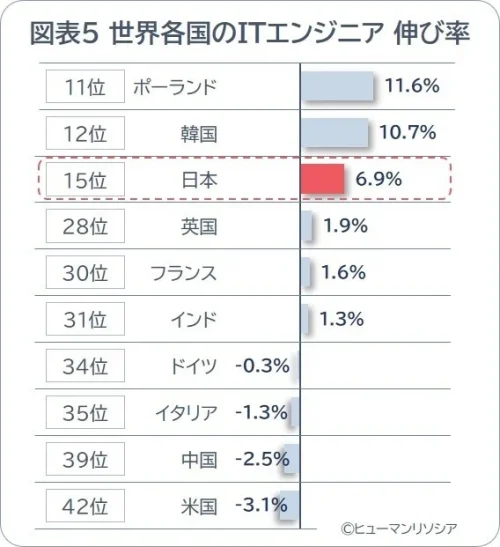 日本はITエンジニア数が前年比6.9%増と大きく伸長し、世界4位を維持したものの、その供給源となる「IT分野の卒業者数」の平均伸び率は2.2%にとどまり、G7で最下位という結果になった。