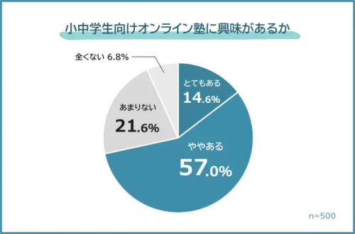 調査は小中学生の子どもを持つ保護者500名(女性392名、男性108名)を対象に12月20日~1月3日に行われた。それによると、小中学生向けオンライン塾に「興味がある」と回答した親は71.6%に上った。