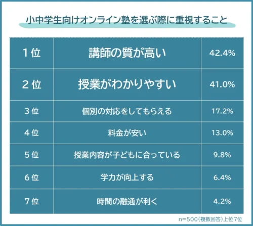 小中学生向けオンライン塾を選ぶ際に重視することを訊ねたところ、1位「講師の質が高い」42.4%、僅差の2位で「授業がわかりやすい」41.0%となり、やる気アップや学力向上につながる「指導力」が上位にランクインした。