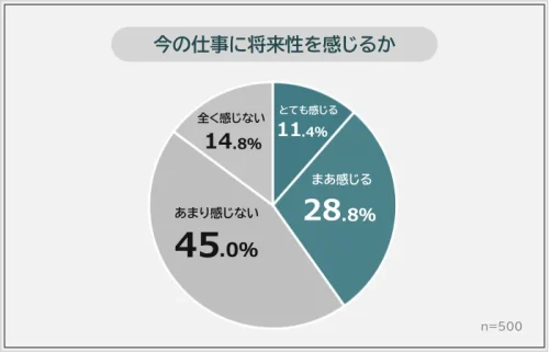 調査では、現職に将来性を「感じる」と回答した人は40.2%にとどまり、働き方や技術の変化を背景に、職業の先行きに不安を抱く層が一定数いる実態が示された。