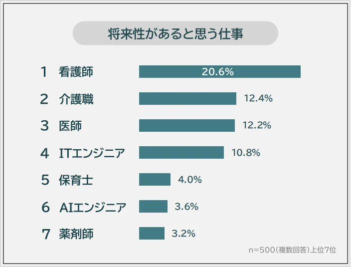 将来性があると思う仕事の1位は「看護師」(20.6%)、2位は「介護職」(12.4%)、3位は「医師」(12.2%)となり、医療・福祉系が上位を占めた。理由としては、高齢化による需要増に加え、「対人支援やきめ細かな観察・声かけなど、人が担う領域が大きくAIで代替されにくい」といった認識が挙げられている。一方で、ITエンジニア(4位)やAIエンジニア(6位)といった、デジタル化やAI活用を支える職種も上位に入り、技術進展に伴う需要拡大への期待がうかがえる。
