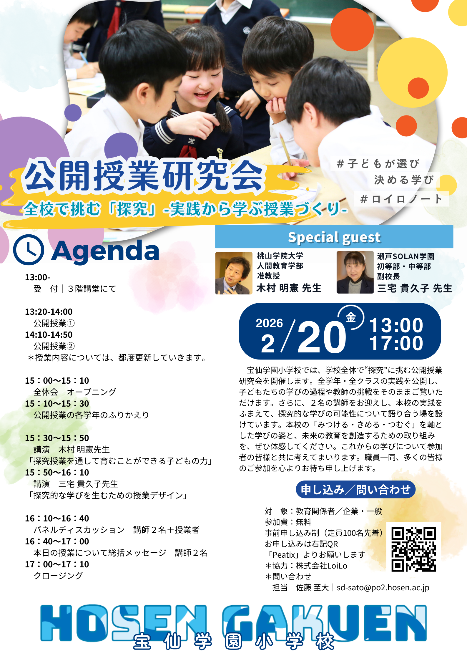 当日は全学年・全クラスの授業が公開され、子どもたちの思考の揺らぎや挑戦の過程、そしてそれを支える教師の試みが、ありのままの姿で共有される。授業実践の提示にとどまらず、子どもの学びの姿を起点に、探究的な学びをどのように授業としてデザインし、学校全体の取り組みとして位置づけていくのかについて、2名の講師を迎えて協議が行われる。
