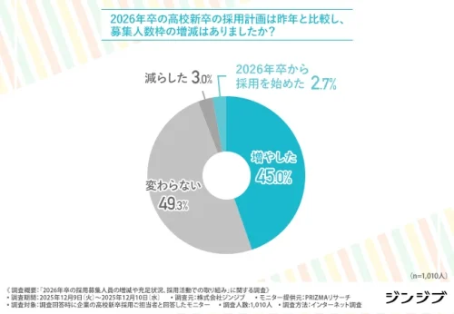 ジンジブは29日、企業の高卒採用担当者を対象に「26年卒の高卒採用の充足状況と採用活動」に関する調査の結果を公表した。