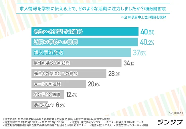 求人情報を学校に伝える上で注力したことは「先生への電話での連絡」「近隣の学校への訪問」「求人票の発送」など。また、ミスマッチを防ぐために特に注力したことは「インターンシップを受け入れた」「高校生と話せるイベントに参加した」「職場見学などで働く先輩社員と話す機会をつくった」などとなった。