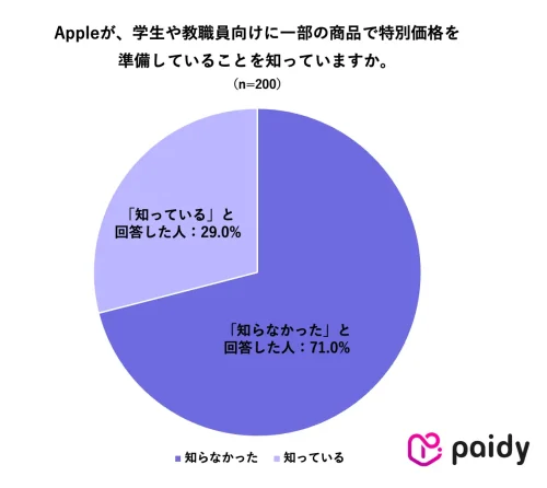 新大学生から高い関心がうかがえるMacだが、おトクに購入できる「学生・教職員価格」(学割)については、7割以上(71.0%)が「知らなかった」と回答。「Macが欲しい」という意向がありながらも、おトクな購入方法があまり知られていないという大きなギャップが明らかになった。