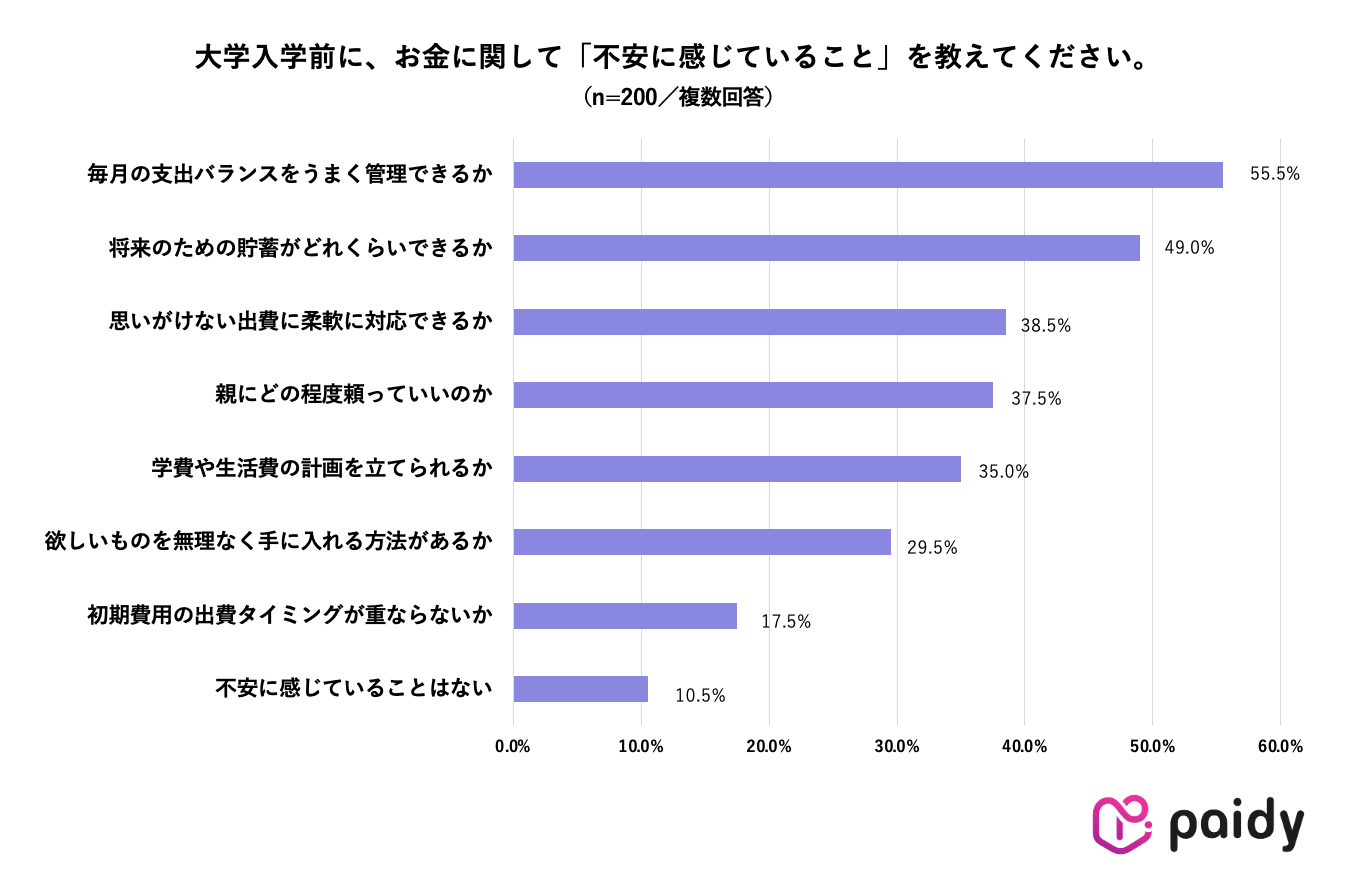 また、大学生活のお金について「不安に感じていること」を尋ねたところ、最も多かったのは「毎月の支出バランスの管理」55.5%で、以下、「将来のための貯蓄がどれくらいできるか」49.0%、「思いがけない出費(旅行、病気、家電の故障など)に柔軟に対応できるか」38.5%が続いた。