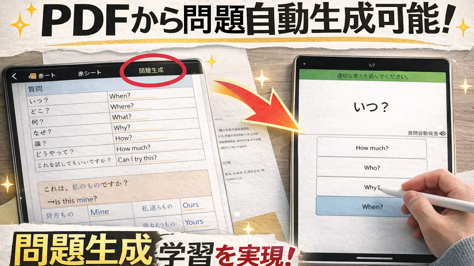 iPadやiPhoneにてPDFから問題を自動生成して4択問題で暗記することが可能。