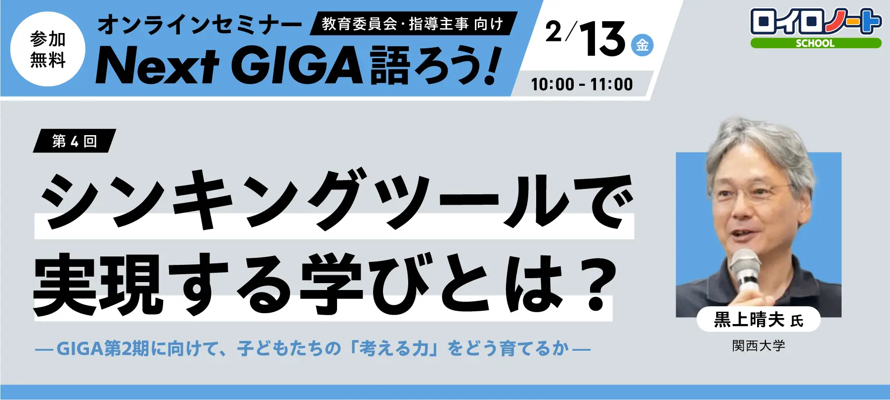 今回のテーマは「思考力」の育成。関西大学教授の黒上晴夫氏をゲストに迎え、思考を促す「シンキングツール(思考ツール)」を切り口として、子どもたちの思考力をどのように育てていくかを考える。