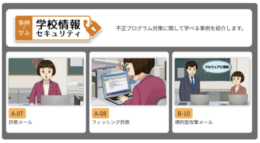 すぐに実践できる3つの対策を紹介。なぜこの対策が効果的なのかを知ることは、正しい知識を身につけ、セキュリティ意識を高めることにつながる。広教が提供する「事例で学ぶ学校情報セキュリティ」には不正プログラム対策に関して学べる事例がある。