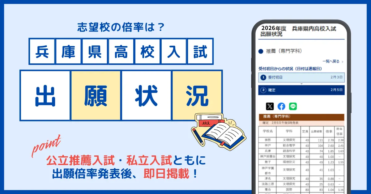 神戸新聞社は、電子版「神戸新聞NEXT」で、兵庫県の公立高校推薦入試および私立高校入試の出願状況(倍率)を2月3日から速報形式で掲載する。