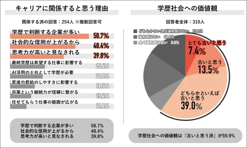 学歴はキャリアに影響すると回答した⼈にその理由を聞くと、「学歴で判断する企業が多い」が 58.7%で最多、次いで「社会的な信用が上がるから」48.4%、「思考力が高いと見なされる」39.8%となった。回答者全体の310人に学歴社会への価値観を聞くと、「古いと思う派」は2024年時の調査から変化がなく59.9%となり、内訳は「とても古いと思う」7.4%、「古いと思う」13.5%、「どちらかといえば古いと思う」39.0%だった。